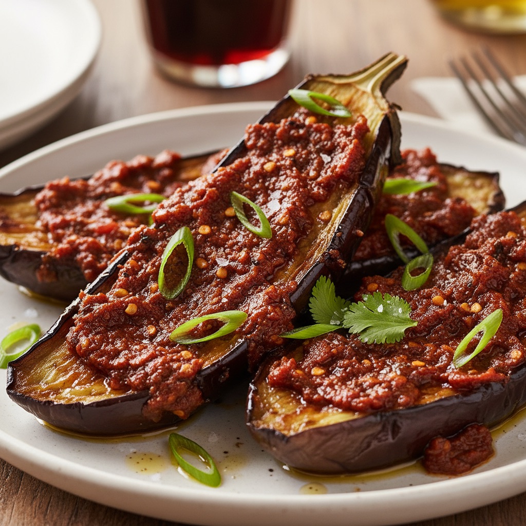 Terong merah muda goreng yang lembut, dilumuri dengan pasta cabai buatan sendiri yang harum, manis, dan pedas.