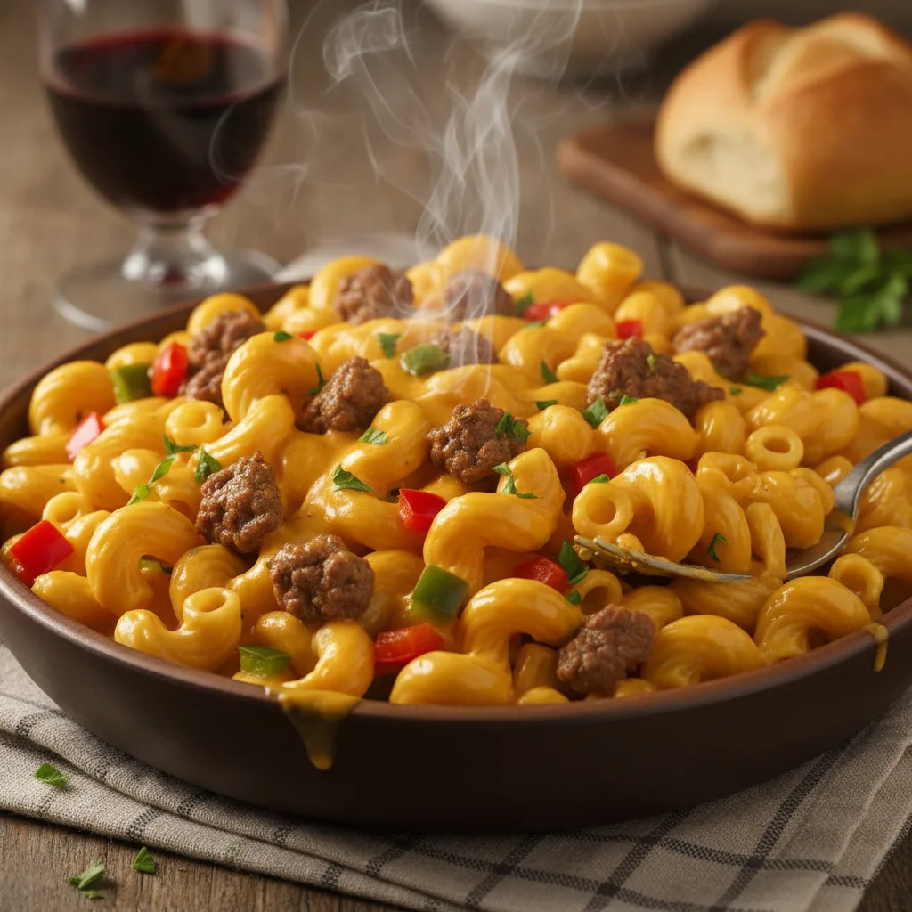 Un ricco e vivace piatto di pasta condito con una saporita salsa al pesto rosso di pomodori secchi, cipolle saltate, tenera carne macinata e abbondante formaggio fuso.